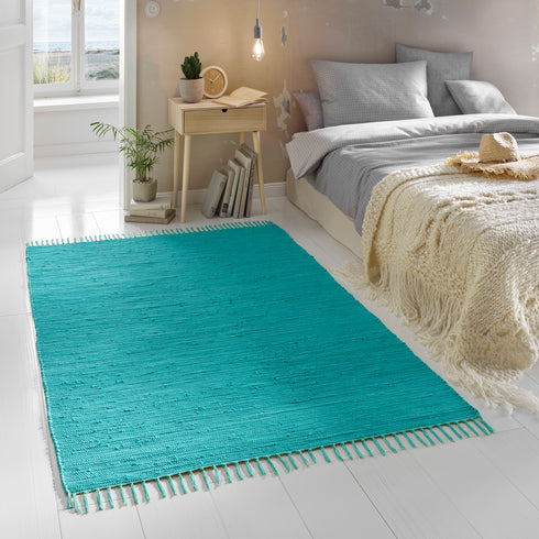 - Flicken-Teppich 100% Baumwolle | Waschbarer Fleckerl mit Fransen | Türkis